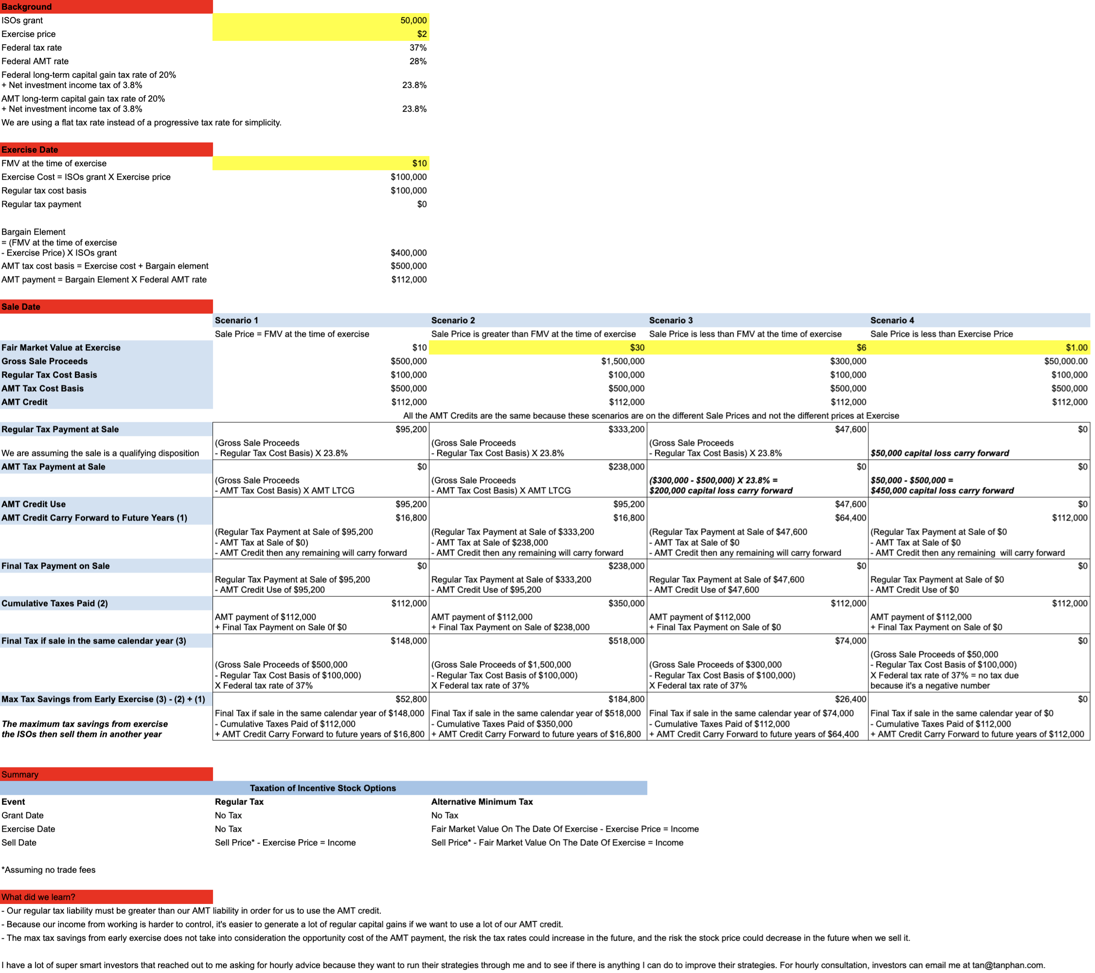 Hi everyone. My name is Tan and I am an independent Certified Financial Planner Practitioner at TAN Wealth Management. In today’s educational video, I will go over 4 scenarios so you can better understand how incentive stock options trigger alternative minimum tax and how alternative minimum tax credits are used to offset regular tax liability.